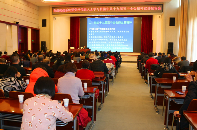 12月15日,张掖市举行市级统战系统暨党外代表人士学习贯彻中共十九届五中全会精神宣讲报告会,邀请中共甘肃省委党校教授曹殊作专题辅导。中共张掖市委常委、市委统战部部长、市政协党组副书记李殿俊主持报告会。民革张掖市委会副主委张兴锋、朱虎及基层组织班子成员、骨干党员共30人参加报告会。