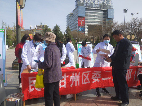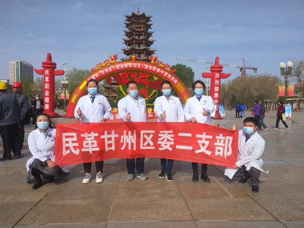 4月25日,民革张掖市甘州区委会直属二支部组织党员在甘州区中心广场开展“共创健康中国 共享职业健康”社会服务活动。支部主委、甘州区医院副主任医师张小玲主持活动。