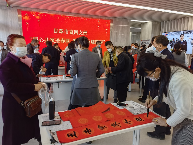 活动现场,气氛热烈,民革党员中的书法家个个激情满怀,挥毫泼墨,将浓浓的新春祝福凝聚在笔端,一个个大气的“福”字,一副副满载祝福、寓意吉祥的春联,表达了浓浓的情意和真诚的祝福,前来领取春联的群众络绎不绝,不到2个小时,300多副春联就送到现场群众手中。