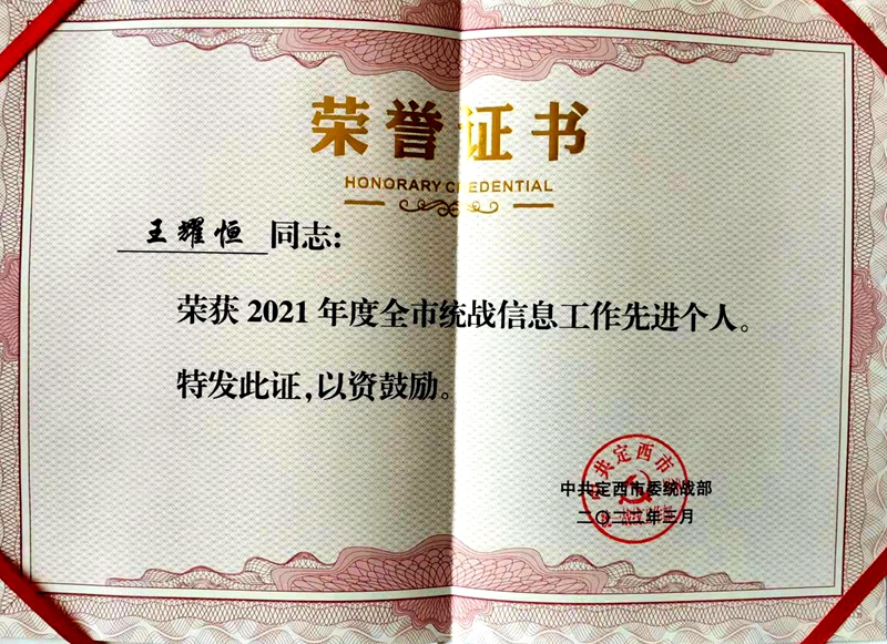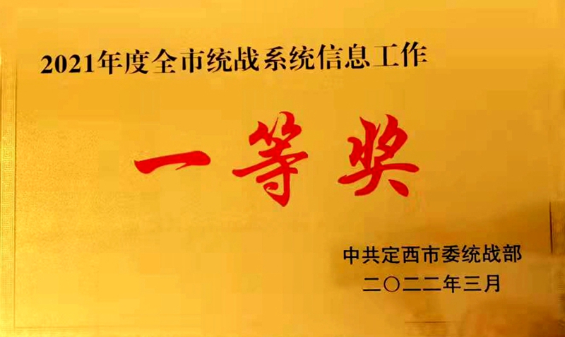 在3月18日召开的定西市统战部长暨民宗局长会议上,民革定西市委会荣获“2021年度全市统战系统信息工作一等奖”,民革定西市委会副主委王耀恒荣获“2021年度全市统战信息工作先进个人”。