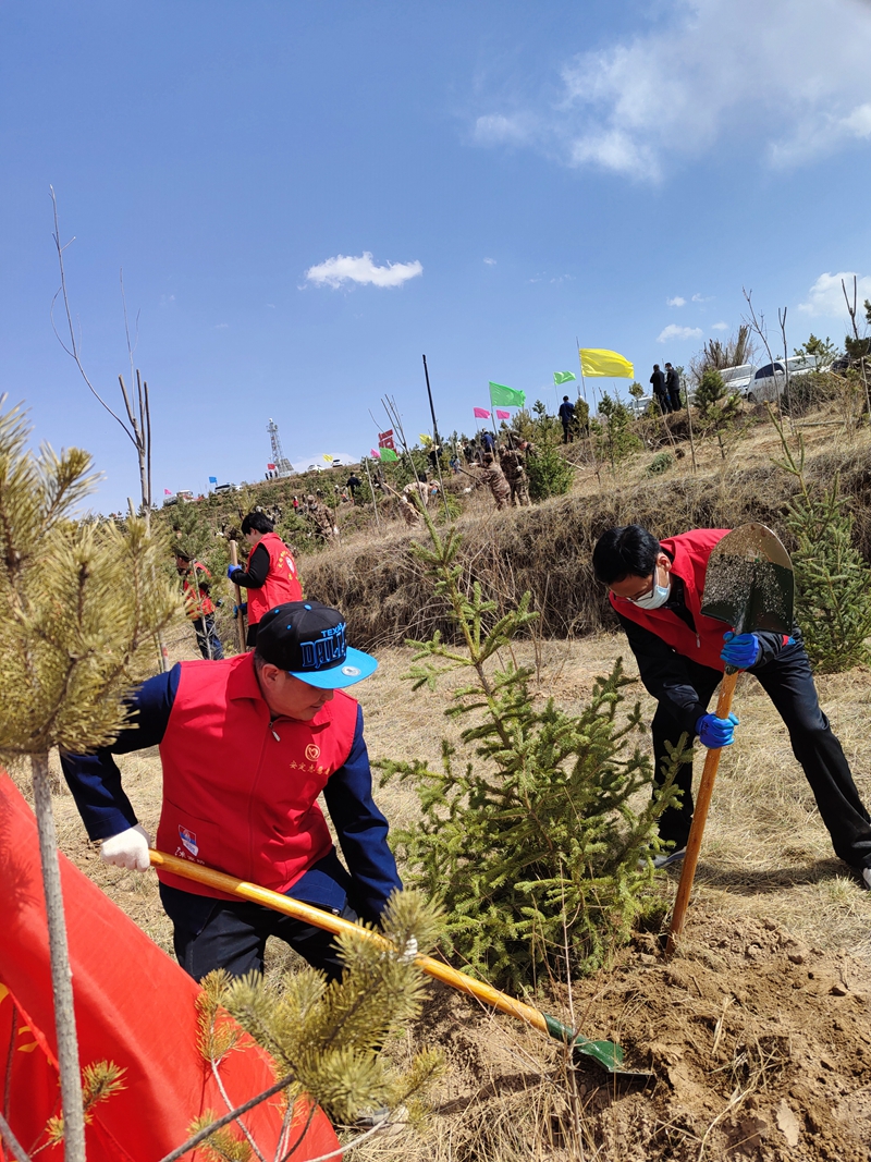 春风和煦,绿意萌动。植树现场,大家热情洋溢、干劲十足。在专业人员的指导下,分工协作、相互配合,搬运树苗、挥锹铲土、扶苗填坑、培实新土……认真细致地完成放苗、填土、踩实、浇水等工序,现场一派繁忙的劳动景象。经过大家辛勤的劳动,荒坡上呈现出一道绿色的风景线,一株株新栽植的榆叶梅、云杉、刺槐、丁香等迎风挺立,焕发出无限生机与活力。
