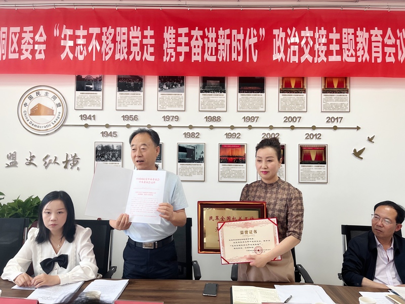 会议学习了习近平总书记关于多党合作的重要论述和各民主党派“矢志不渝跟党走、携手奋进新时代”政治交接主题教育动员会及中共甘肃省委召开的各民主党派省级组织新老班子主要负责同志座谈会精神,学习了中共甘肃省第十四次代表大会精神和平凉市、崆峒区“矢志不渝跟党走、携手奋进新时代”政治交接主题教育有关会议精神,宣读了《民革崆峒区委会“矢志不渝跟党走、携手奋进新时代”政治交接主题教育实施方案》。3名骨干党员围绕主题教育活动开展作了交流发言。朱少峰向民革崆峒区委会机关颁发了民革中央“民革全国机关工作先进集体”荣誉奖牌。