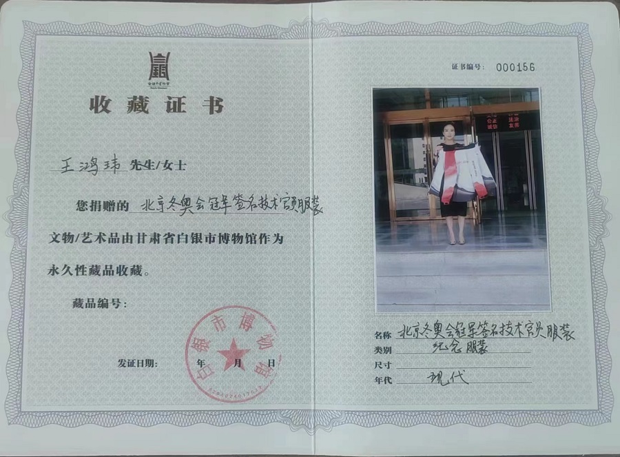 近日,民革党员、2022年北京冬奥会国内技术官员(NTO)王鸿玮,向白银市博物馆捐赠了自己的北京冬奥会冠军签名技术官员服装,白银市博物馆向王鸿玮颁发了收藏证书。