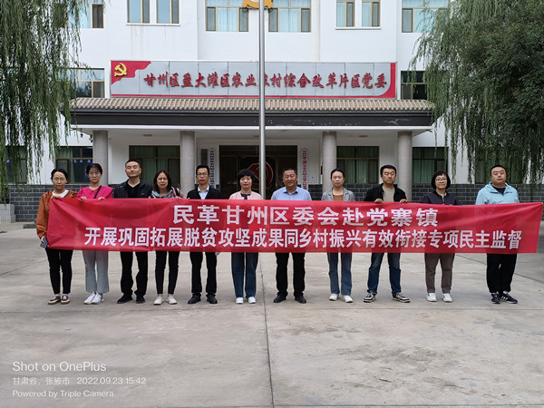 9月23日,民革张掖市甘州区委会赴甘州区党寨镇开展巩固拓展脱贫攻坚成果同乡村振兴有效衔接专项民主监督。民革甘州区委会主委张小玲,专职副主委尉迟金辉参加活动。