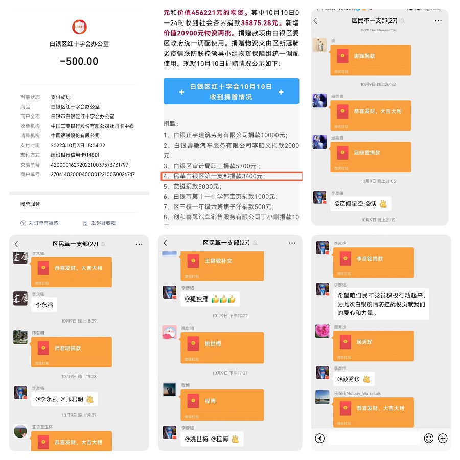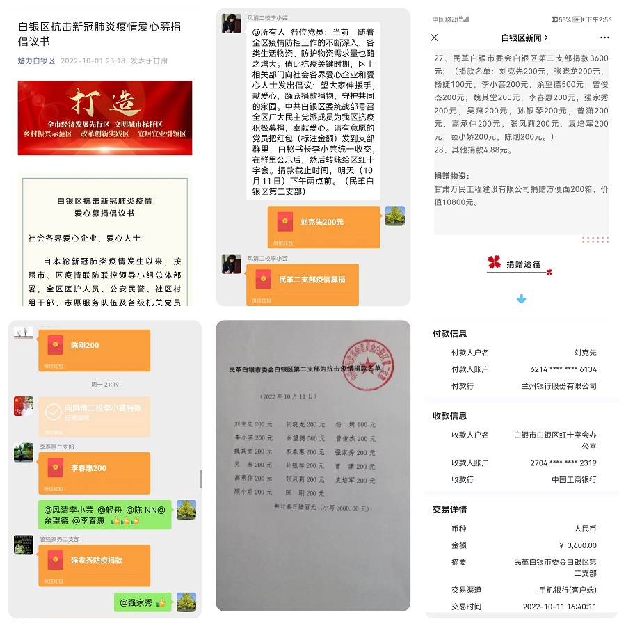 民革白银市委会白银区第一支部、第二支部积极响应市委会号召,第一时间开展奉献爱心助力疫情防控活动。民革白银市白银区第一、第二支部向党员发起爱心捐款倡议。倡议书发出后,党员们积极响应,自觉自愿通过支部微信群内转账的方式进行捐款,一笔笔爱心捐款迅速汇集起成一股股暖流。据统计,自10月3日至10月11日,民革白银区第一支部15名党员共捐款3900元,民革白银区第二支部17名党员捐款3600元。总计7500元的捐款捐赠给了白银区红十字会,用于支持白银市的新冠疫情防控工作。