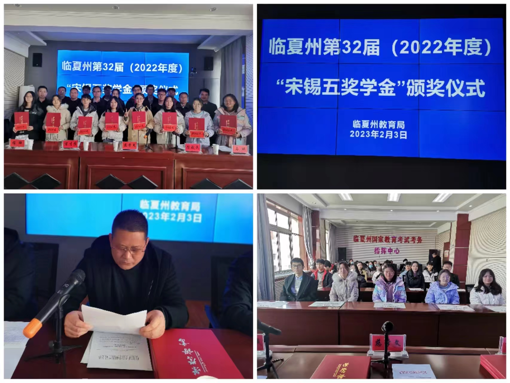 2月3日,临夏州第32届(2022年度)“宋锡五奖学金”颁奖仪式在临夏州教育局举行。中共临夏州委统战部、州教育局相关负责人,民革党员、出资人亲属代表宋才彦,学生资助管理中心工作人员、获奖优秀学生及部分家长共40余人参加颁奖仪式。