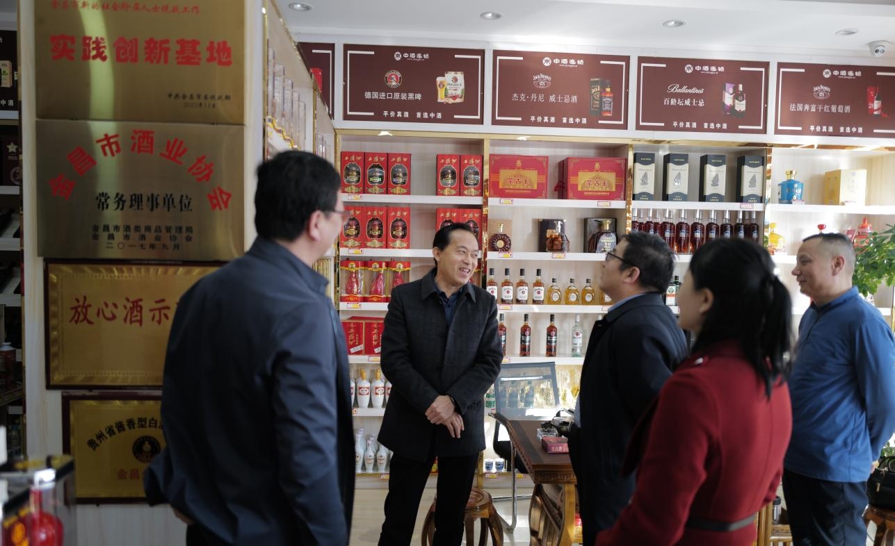 调研组一行参观了金昌德隆商贸公司中酒连锁旗舰店,现场听取了民革党员、企业家甘江源对相关情况的介绍,并与相关人员交流了实践创新基地建设工作。