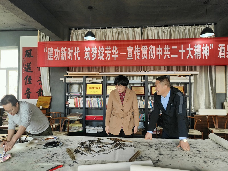4月22日,民革酒泉市委会在民革酒泉中山书画院举办“建功新时代 筑梦绽芳华--贯彻落实中共二十大精神”书画展。酒泉市副市长、民革酒泉市委会主委靳巧荣出席活动,中共酒泉市委统战部副部长、一级调研员贺俊生应邀参加活动。