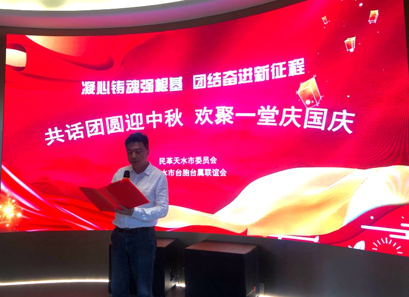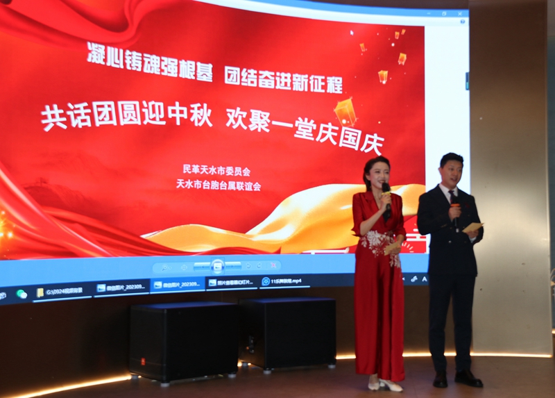 9月24日,民革天水市委会联合天水市台胞台属联谊会举办“共话团圆迎中秋 欢聚一堂庆国庆”主题联谊会。中共秦州区委副书记、统战部部长王涛出席联谊会。民革天水市委会主委、天水市台联会长魏芳,民革天水市委会副主委窦文、艾天寿,天水市台胞台属代表和民革党员共80余人参加联谊会。