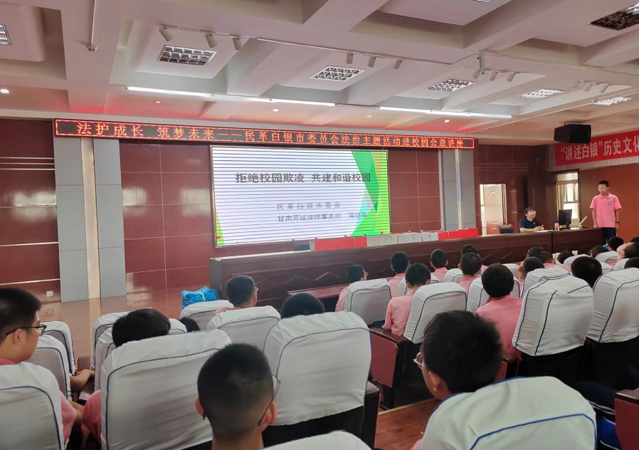 活动中,民革白银市委会社会和法治委员会委员、甘肃开诚律师事务所律师蒲迎春为全校学生上了一堂拒绝校园欺凌,共建和谐校园为主题的法律知识公益讲座。通过现场讲解、互动问答等方式,结合当下热点案例事件,对什么是校园霸凌、如何预防以及遭遇霸陵后怎么办等内容进行了宣传,向听讲学生敲响了警钟,让学生进一步认识到校园欺凌的危害性和严重性。