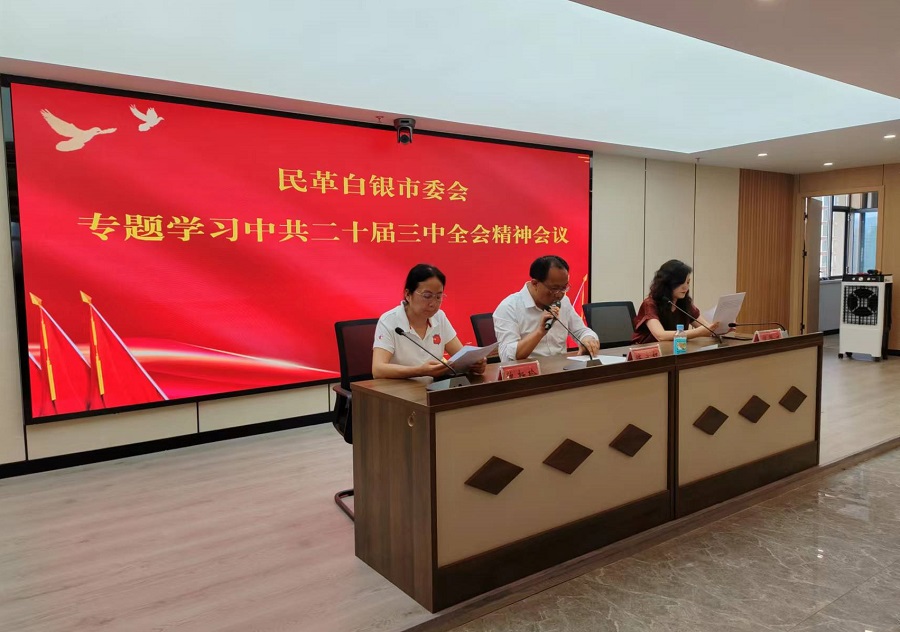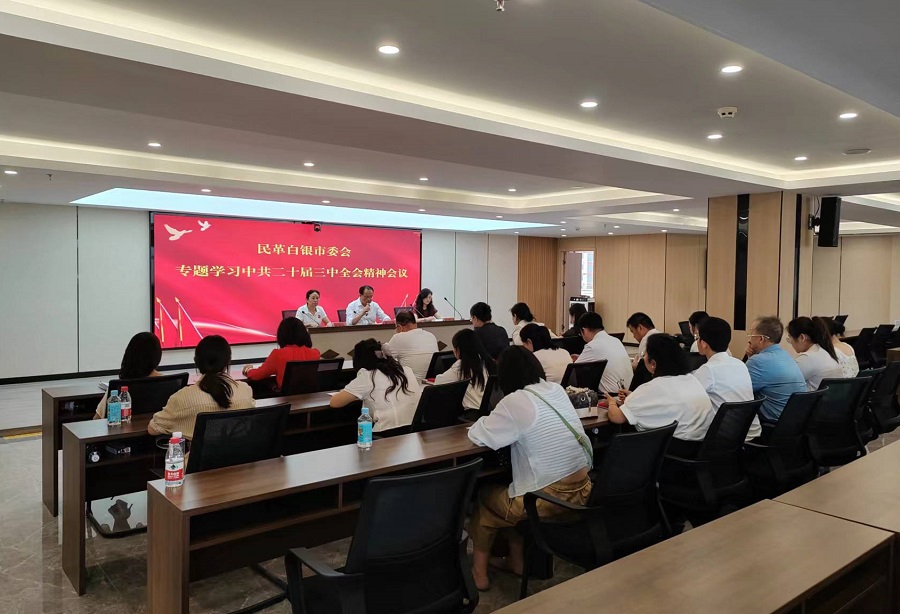 近日,民革白银市委会理论学习中心组(扩大)召开学习会议,专题学习中共二十届三中全会精神。民革白银市委会班子成员,市委会委员,市委会监委会委员、党员代表等30人参加会议。
