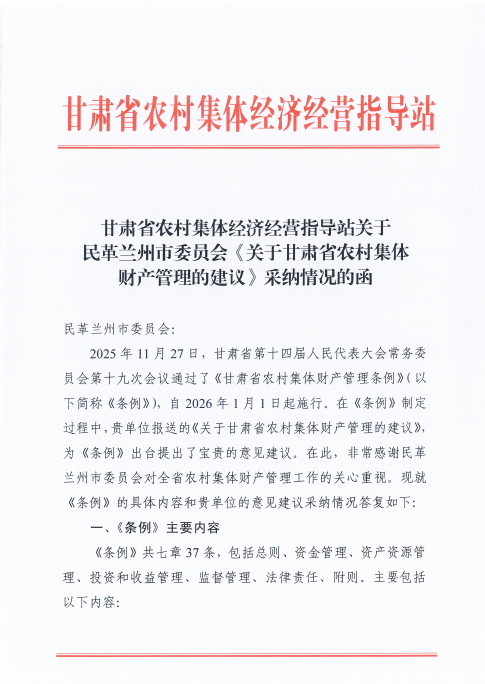 近日,智库专家史如霞、谯喜龙、彭朝花撰写的《关于甘肃省农村集体财产管理的建议》经民革兰州市委员会报送后,其中3条建议被《甘肃省农村集体财产管理条例》吸收采纳(以下简称《条例》)。《条例》在2025年11月27日甘肃省第十四届人民代表大会常务委员会第19次会议通过,自2026年1月1日起施行。建议提出,建立农村集体财产清查、保管、使用、处置、公开等制度;建立常态化年度清查盘点制度,全面摸清存量资产资源的数量、价值、权属、位置和使用状况;建立全省联网的集体资产管理数据库,在财务核算,合同管理、财产登记、产权交易、财务监管等方面应用信息化技术,实现数字化管理。