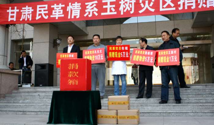 据悉,甘肃民革各级组织和广大党员正在以多种形式为玉树抗震救灾、重建家园奉献爱心。民革党员瞿金叶、包锐分别通过其他渠道向灾区捐款10万元和5万元。民革党员刘翠林作为甘肃省第二批医疗救援队成员已奔赴玉树灾区抢救伤员。由民革党员莫兴邦带领的甘肃省心理咨询师学会抗震救灾心理援助队第一批队员也将于28日赶赴玉树,开展心理干预和援助工作。