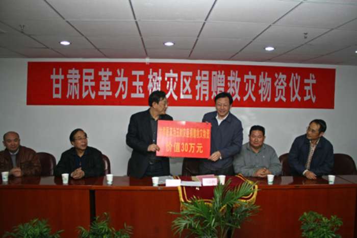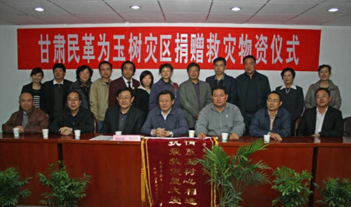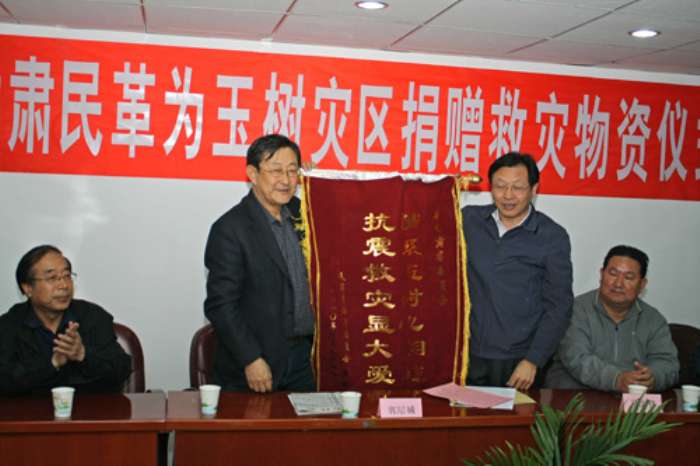 4月24日中午,甘肃民革支援玉树灾区物资车队抵达西宁,民革甘肃省委会向玉树灾区捐赠款物合计30万元,青海省民政厅专门致信表示感谢。在民革青海省委机关随即举行的甘肃民革为玉树灾区捐赠救灾物资仪式上,民革甘肃省委会主委郭层城亲自将捐赠善款交给民革青海省委员会主委马志伟。