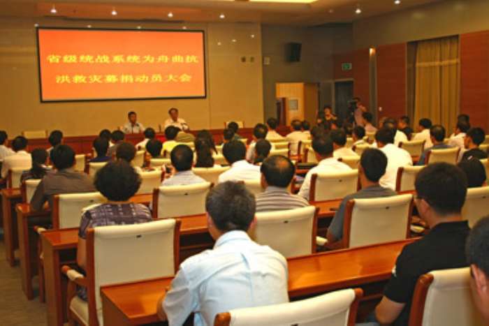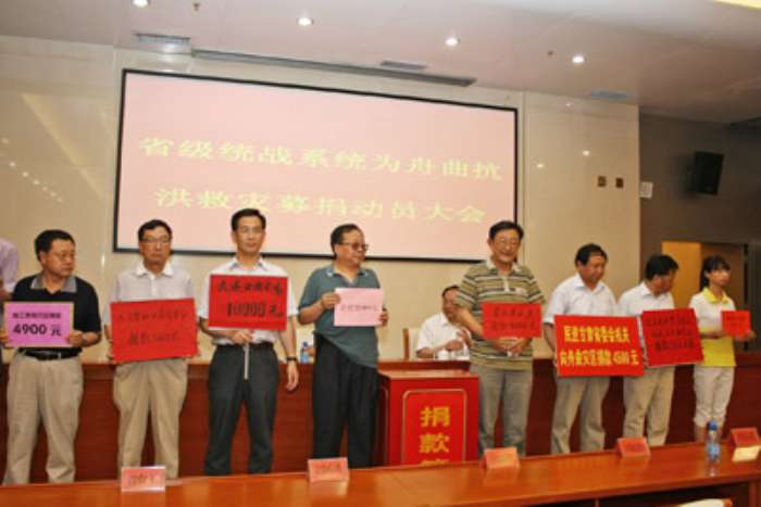 8月9日,中共甘肃省委统战部召开省级统战系统募捐动员大会,来自省级统战系统的15家单位共捐款37.08万元。民革甘肃省委机关干部为灾区捐款9000元,主委郭层城代表省委会参加捐赠活动。