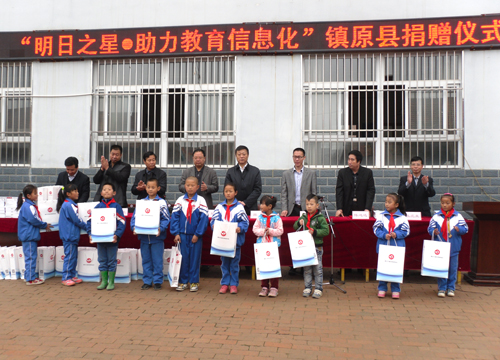 10月27日,“明日之星——助力教育信息化”捐赠仪式在镇原县举行。这次捐赠活动是由民革甘肃省委会、省教育厅、省山东商会联合明日之星教育基金会、明日之星集团发起的,旨在向欠发达地区农村义务教育学校和学生捐赠教学仪器设备和学习用品,助力学校发展和学生进步。民革甘肃省委会副主委陈强、明日之星教育基金会助学工程组织部部长石茂真、镇原县政协主席慕瑶及受助学校师生共900多人参加了捐赠仪式。