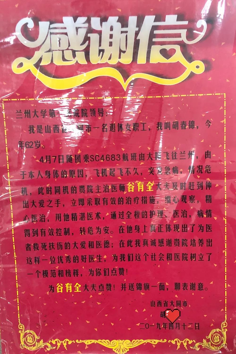 4月7日随团乘SC4683航班由大同飞往兰州,由于本人身体的原因,飞机起飞不久,突发病急,情况危急。此时同机的贵院主治医师(注:谷主任实为我院副主任医师、副教授)谷有全大夫及时赶到伸出大爱之手,立即采取有效的治疗措施,细心观察,精心医治,用他精湛医术,通过全程的护理、医治,病情得到有效控制,转危为安。在他身上真正体现出了一位医者救死扶伤的大爱和医德。在此我真诚感谢贵院培养出这样一位优秀的好医生,为我们这个社会和医院树立了一个规范和榜样,为你们点赞!