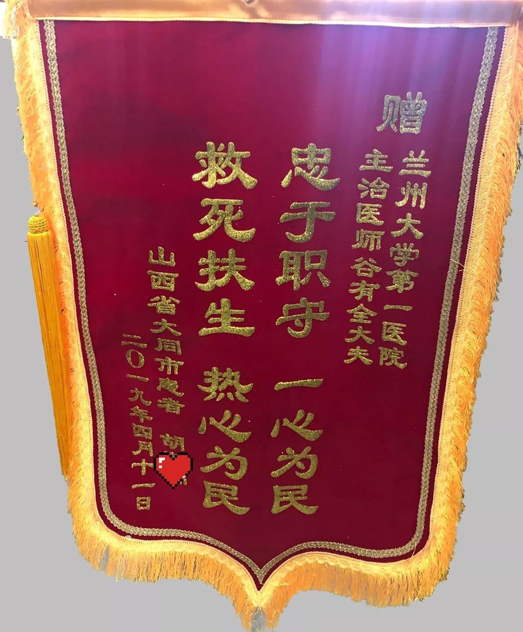 2019年4月17日,一份沉甸甸的“礼物”交到了兰州大学第一医院神经内科副主任医师、副教授谷有全博士的手中。这是一份从远隔千里外的山西省大同市寄到兰州的礼物——一面制作精美的锦旗、一封言辞发自肺腑的感谢信。