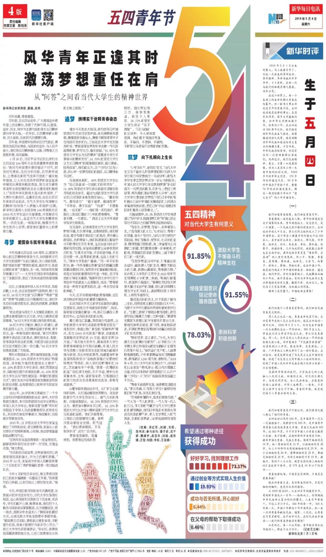 新华每日电讯五四青年节专版。版面编辑:完颜文豪、陈琰泽