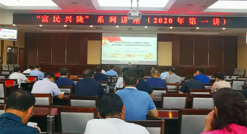 7月21日,甘肃省“富民兴陇”系列讲座第一讲在中共甘肃省委党校(甘肃行政学院)举行。中共甘肃省委常委、省委统战部部长、省政协党组副书记马廷礼作了题为《深入学习贯彻党的十九届四中全会精神,着力彰显统一战线在国家治理中的法宝作用》专题讲座。民革武威市委会组织全体机关干部在中共武威市委党校分会场集中聆听了讲座。