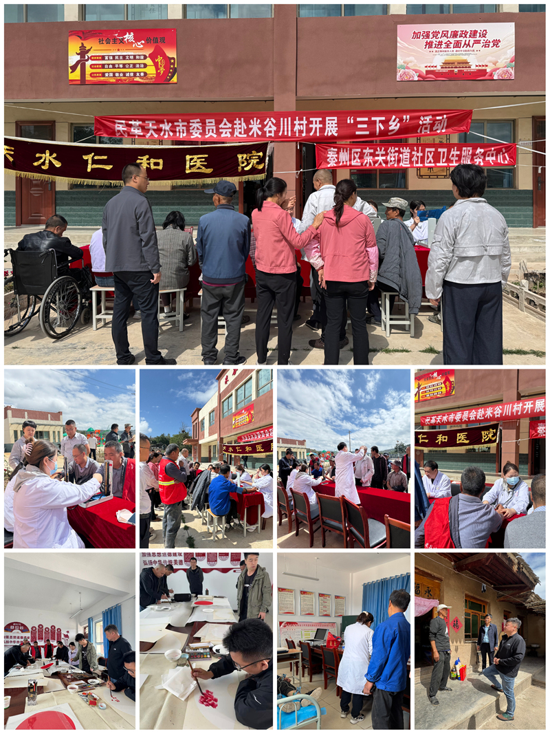 为进一步丰富基层群众精神文化生活,助力乡村振兴。9月25日,民革天水市委会组织党员中的书画工作者、医疗专家及机关干部,深入甘谷县金山镇米谷川村,开展了一场内容丰富、温暖人心的文化卫生“三下乡”活动,为村民们送去节日的问候与实实在在的服务。