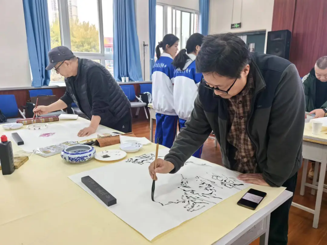 11月7日,应兰州交通大学附属中学邀请,市政协人口资源环境委员会组织滕海成委员工作室和民革兰州画院的10名书画家来到学校的书法课堂,开展“书法进校园公益活动”。民革兰州市委会副主委张鸿俊、民革兰州画院副院长南文智和民革兰州画院秘书长张宇参加活动。