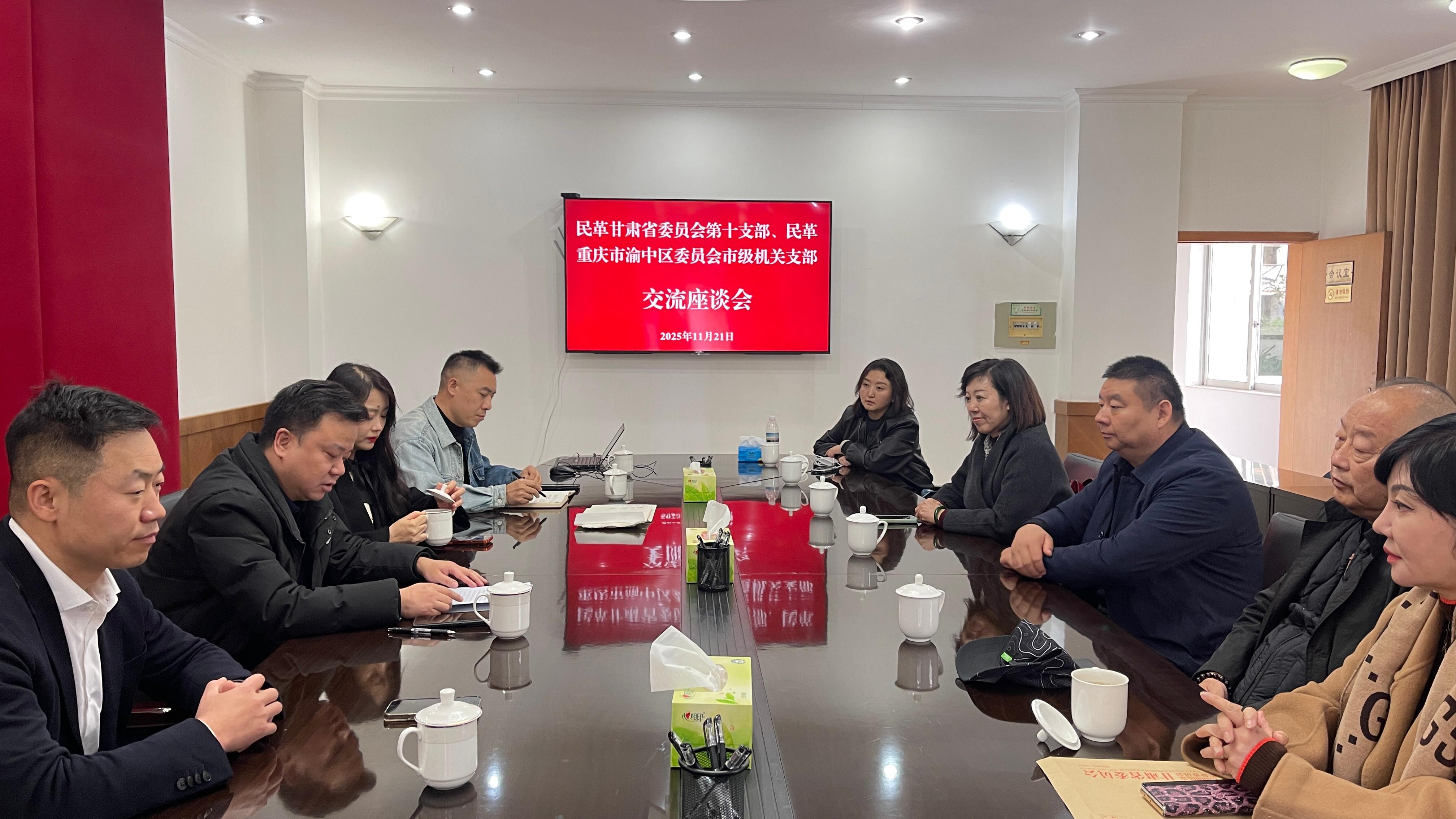 2025年11月21日,民革甘肃省委会直属第十支部主委贾红武,副主委雷彩明、马洁妮带领支部党员王军、王育霏、张心华、李燕一行七人应邀赴渝,与民革重庆市渝中区委员会市级机关支部齐聚山城,成功开展共建交流活动。两地组织围绕加强新时代民主党派自身建设,聚焦组织架构优化与党员发展机制等议题展开深入研讨,为推动民革事业高质量发展凝聚共识、汇聚合力。