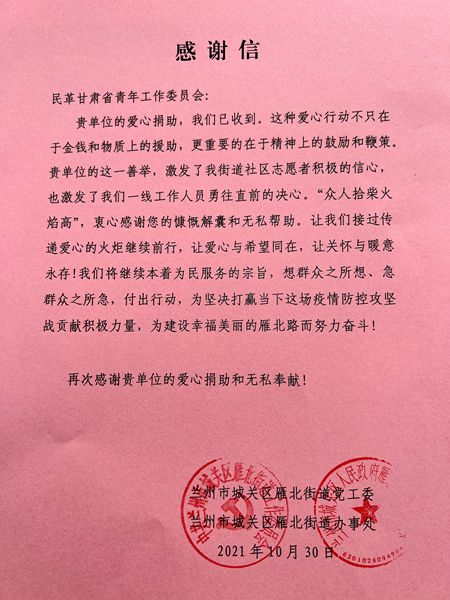 中共兰州市城关区五泉街道党工委书记孟亚伟、中共兰州市城关区雁北街道党工委副书记马红莉感谢民革甘肃省委会青年工作委员会的关心和慰问,表示全体社区工作人员和志愿者将把这份关心关爱转化成工作动力,全身心投入到抗疫工作中,坚守一线,坚决打赢这场疫情防控阻击战、歼灭战。